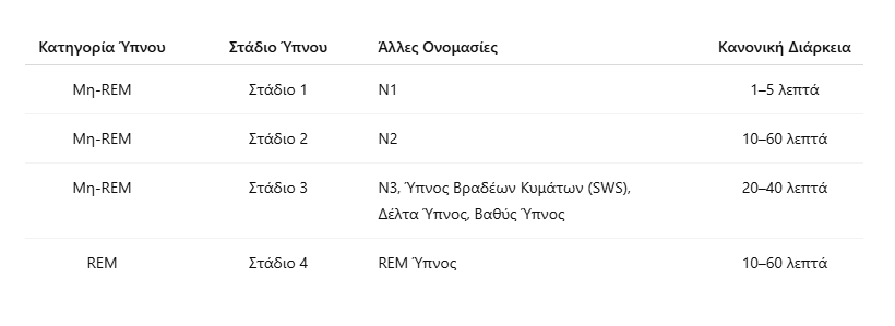 Ο μη-REM ύπνος υποδιαιρείται σε τρία στάδια (N1, N2 και N3), τα οποία αντιπαραβάλλονται με τον REM ύπνο, γνωστό και ως παράδοξος ύπνος, λόγω της έντονης εγκεφαλικής δραστηριότητας που τον χαρακτηρίζει3 .