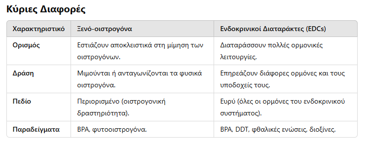 Οι ΕDCs είναι μια ευρύτερη κατηγορία χημικών ουσιών που μπορούν να επηρεάσουν το ενδοκρινικό σύστημα γενικότερα, διαταράσσοντας διάφορες ορμονικές λειτουργίες (όχι μόνο αυτές που σχετίζονται με τα οιστρογόνα).